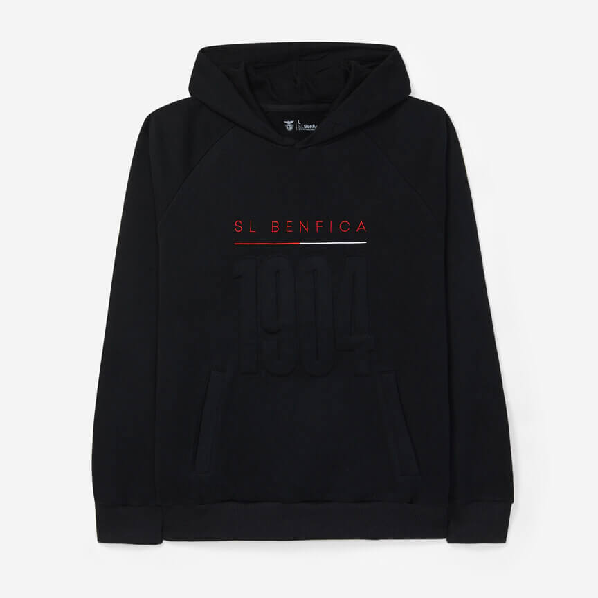 Sweat com capuz preta, cardada, modelo regular fit, com decote redondo, bolso tipo canguru, punhos e cintura canelados e “SL Benfica” bordado, ao centro, a vermelho sobre uma linha vermelha e branca, e o ano de fundação do clube, 1904, a preto.