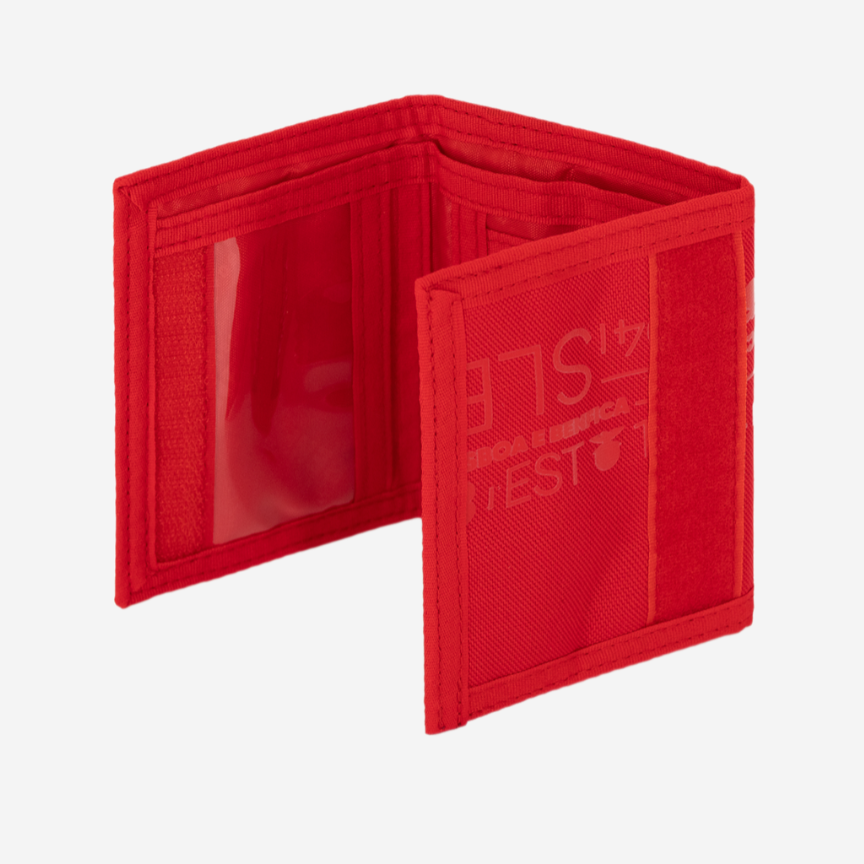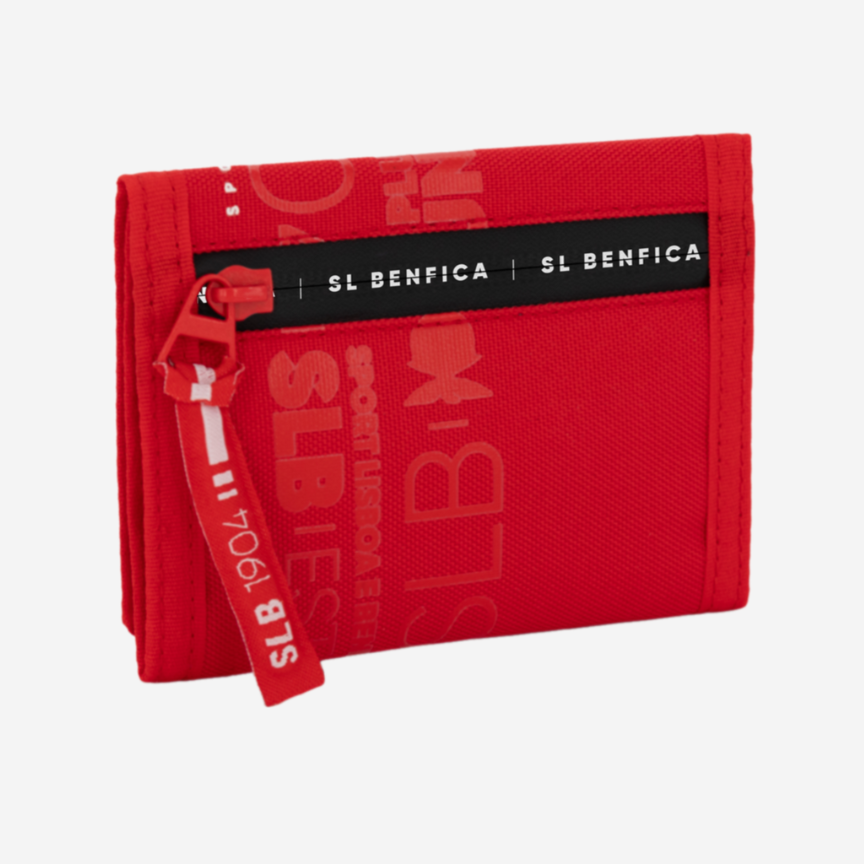 Carteira vermelha, com o emblema do Sport Lisboa e Benfica, aplicado na parte da frente.