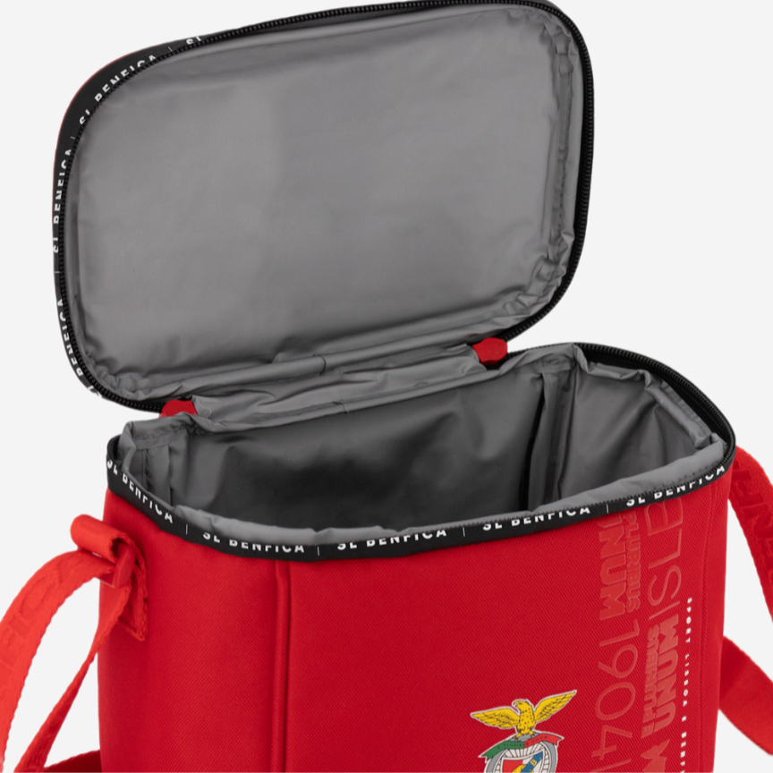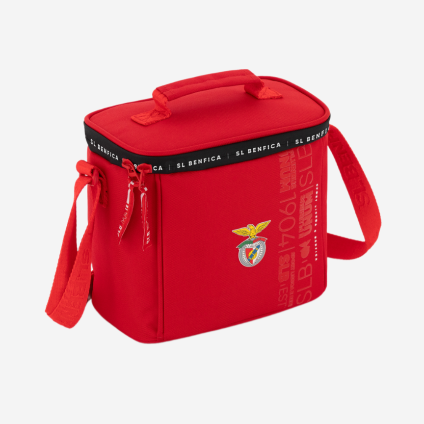 Lancheira térmica vermelha, com o emblema do Sport Lisboa e Benfica, aplicado na frente.
