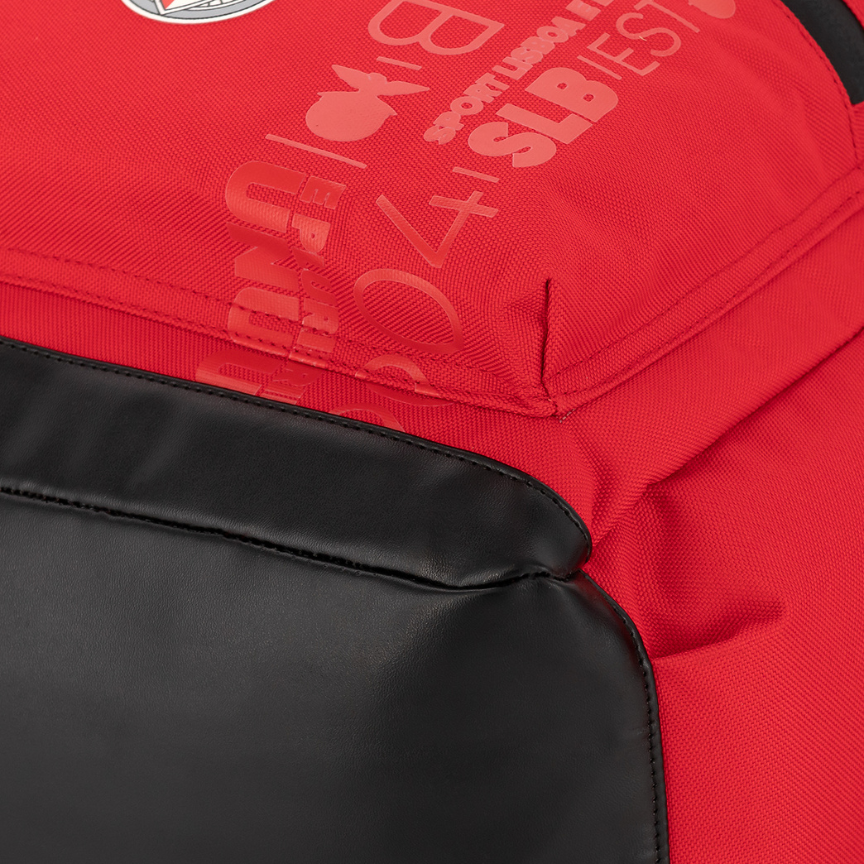 Mochila vermelha, com o emblema do Sport Lisboa e Benfica, aplicado na parte da frente.